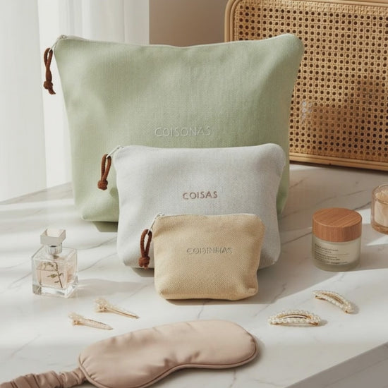 Três bolsas em linho alentejano — coisinhas, coisas e coisonas — bordadas à mão pela La Cerise e confecionadas em colaboração com uma artesã local aka. minha tia.