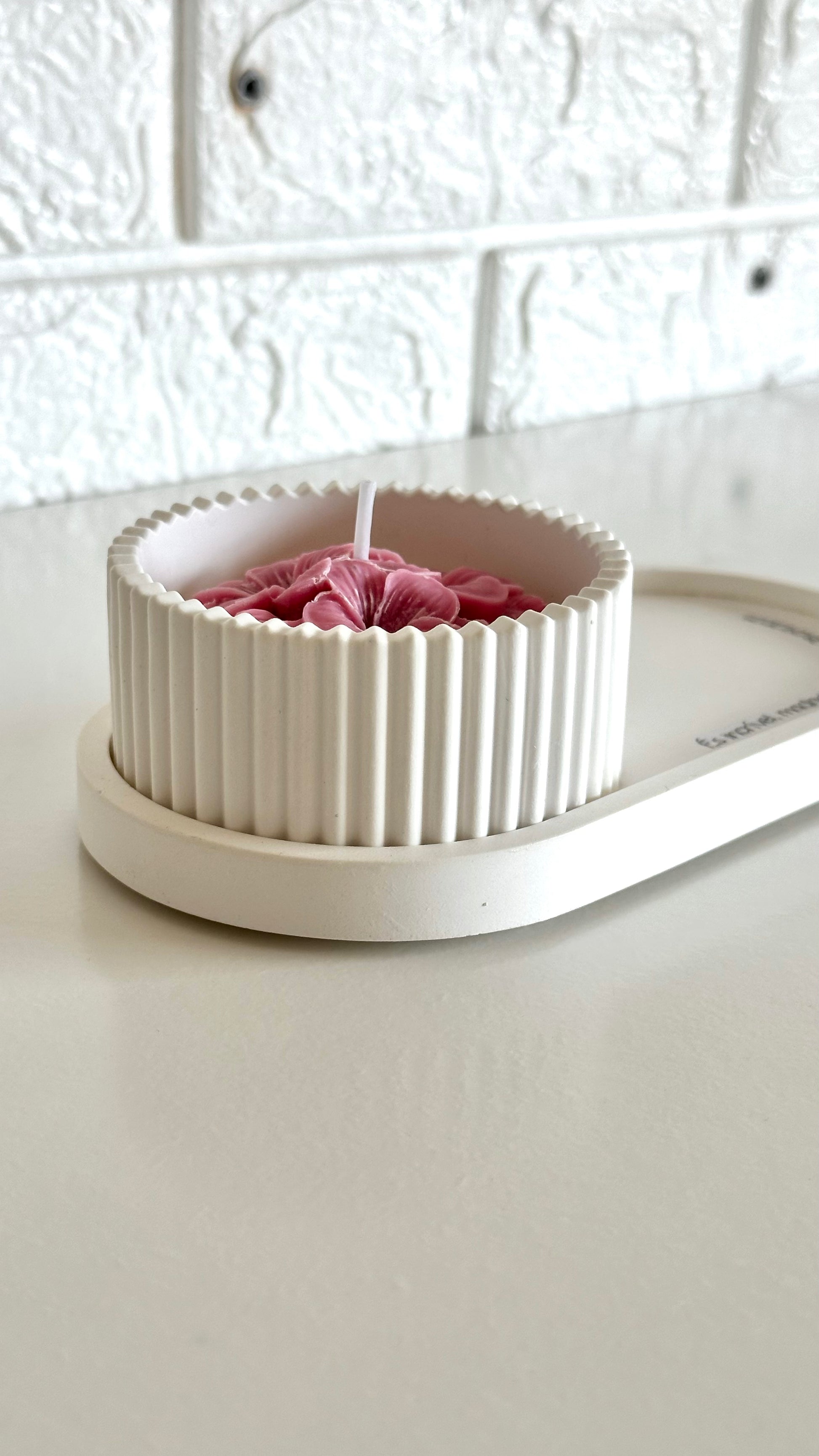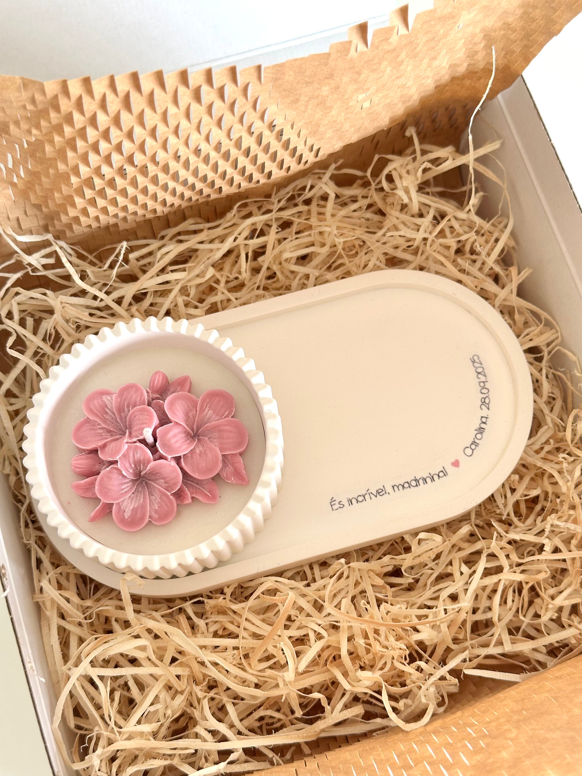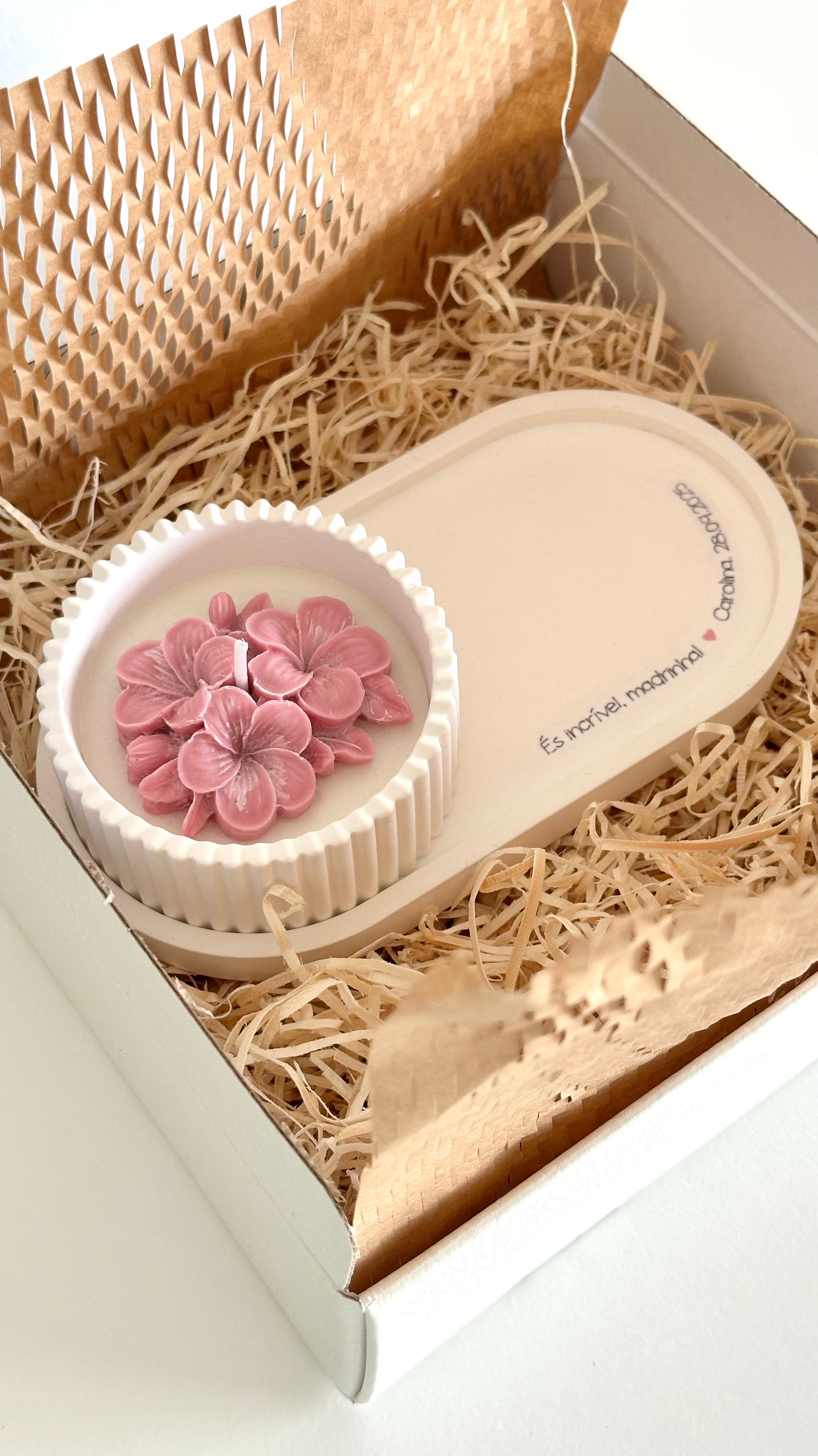 Dentro da caixa, uma bandeja personalizada eterniza o teu agradecimento, e uma taça canelada com vela aromática transforma o instante em pausa e luz.
