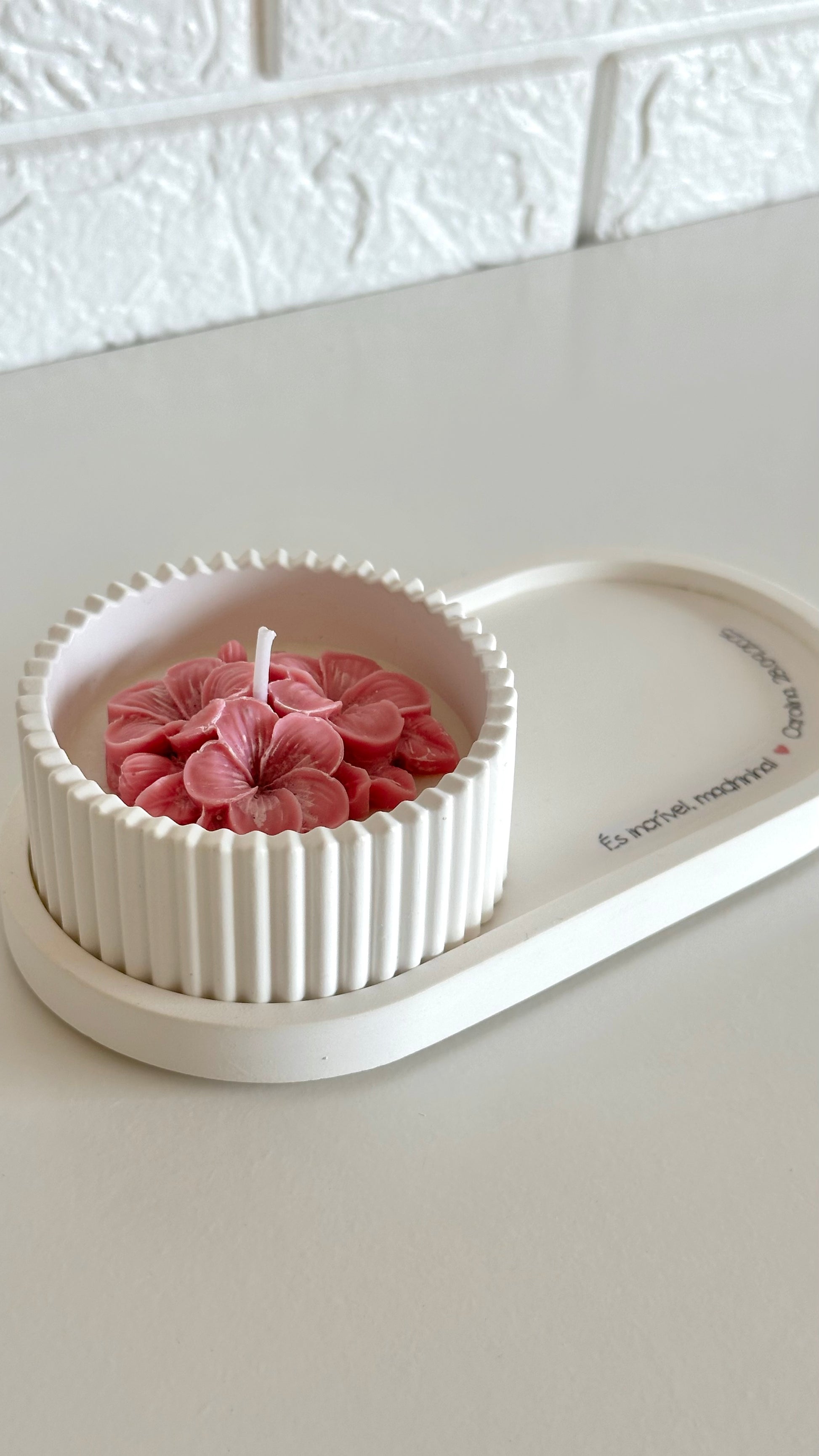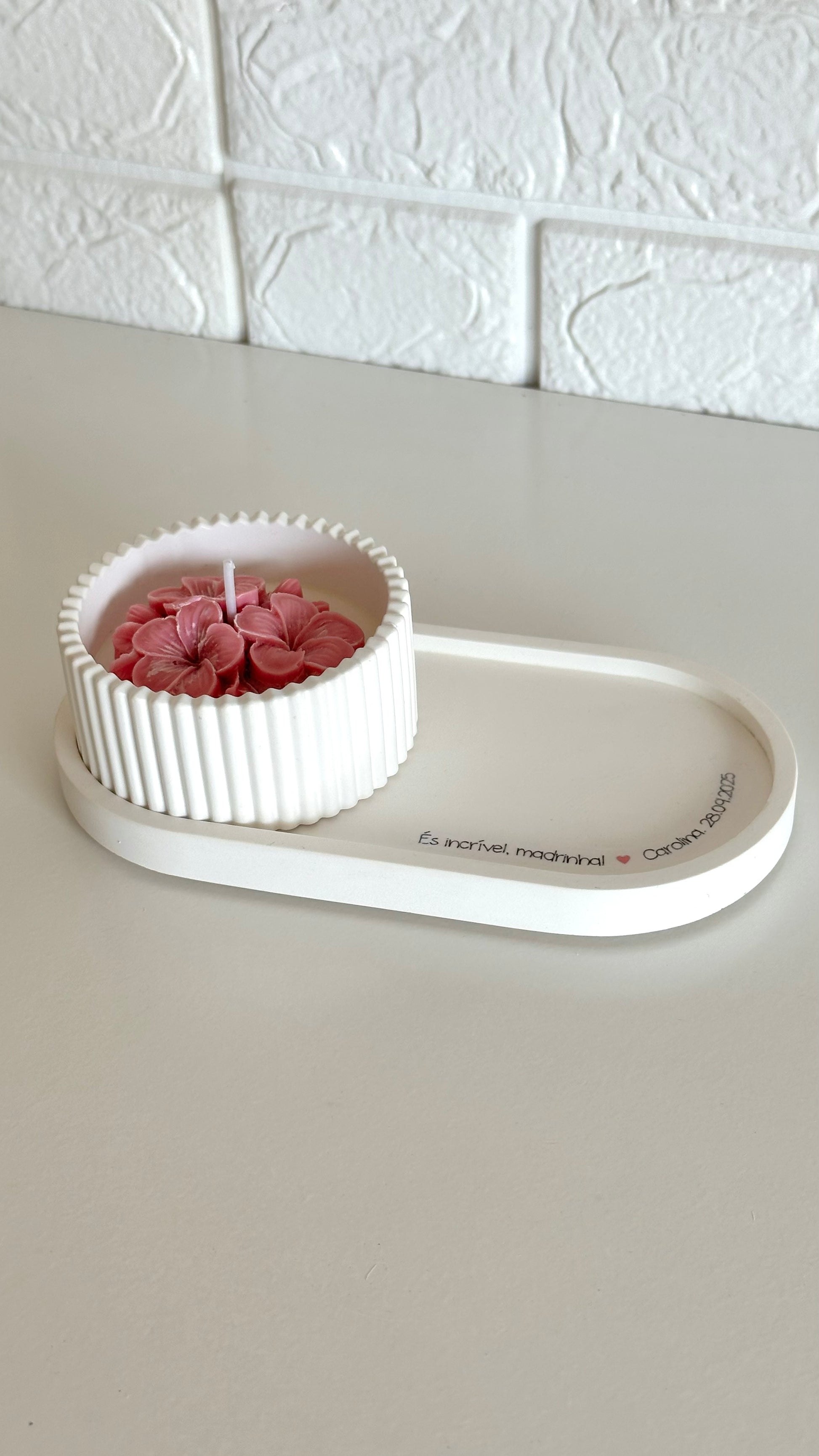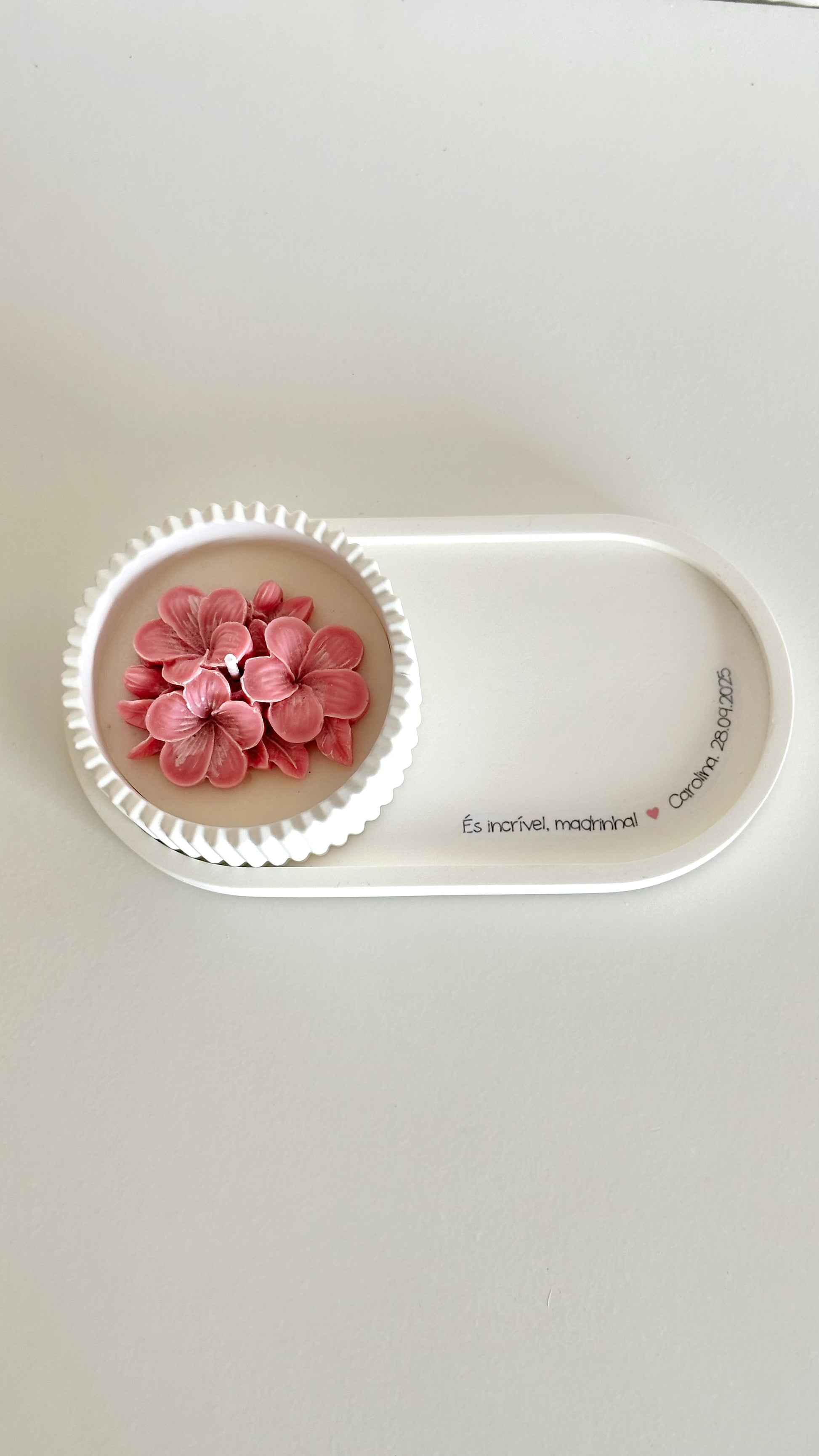 Podes personalizar o texto da bandeja e escolher a cor da flor da vela e a fita que envolve a caixa, tornando cada conjunto ainda mais único e cheio de significado.