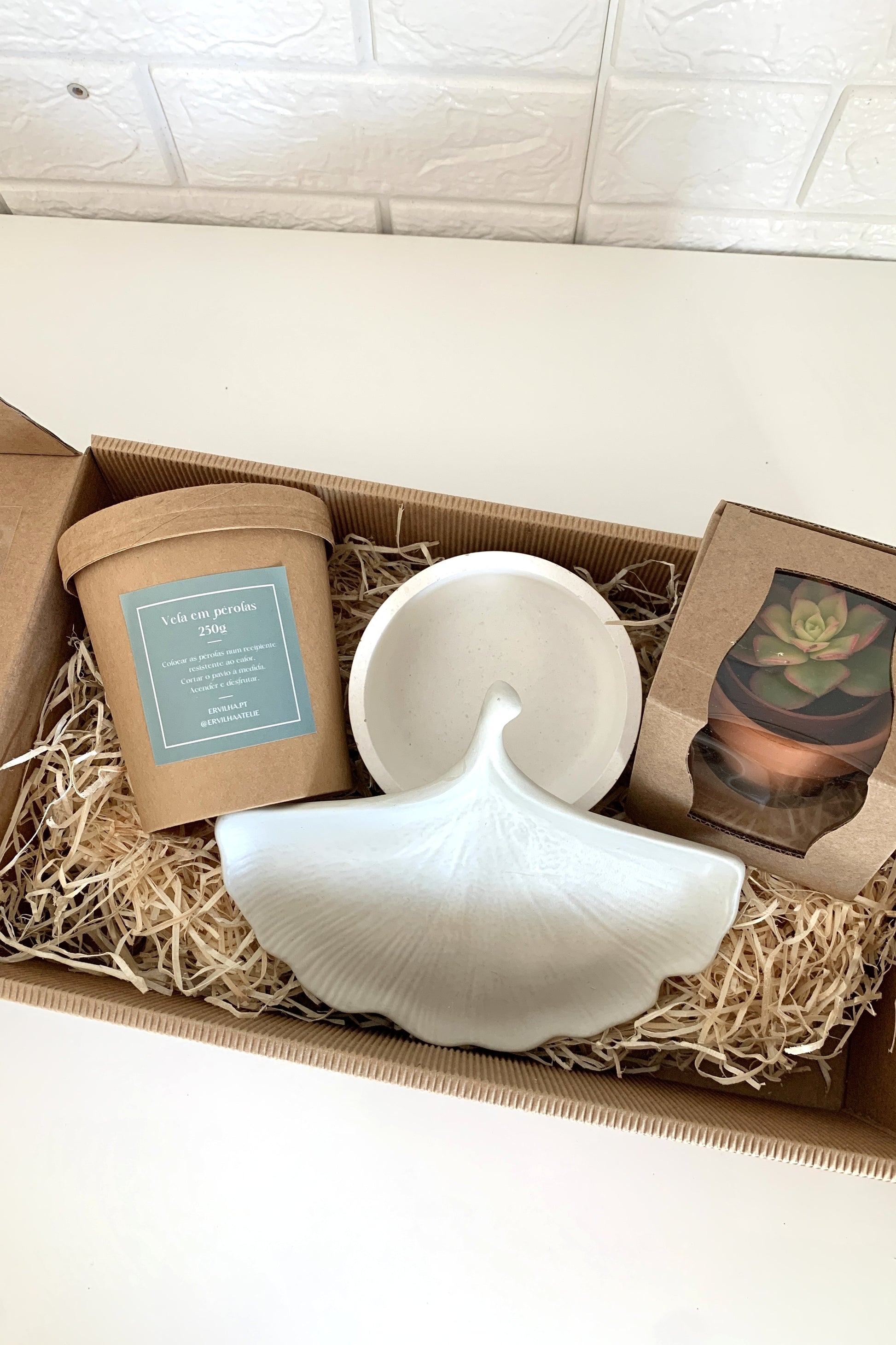 Inclui vela em pérolas, uma mini taça decorativa, uma mini suculenta em caixa e uma bandeja em forma de folha de Gingko — todos os elementos escolhidos para evocar harmonia, beleza e gratidão.