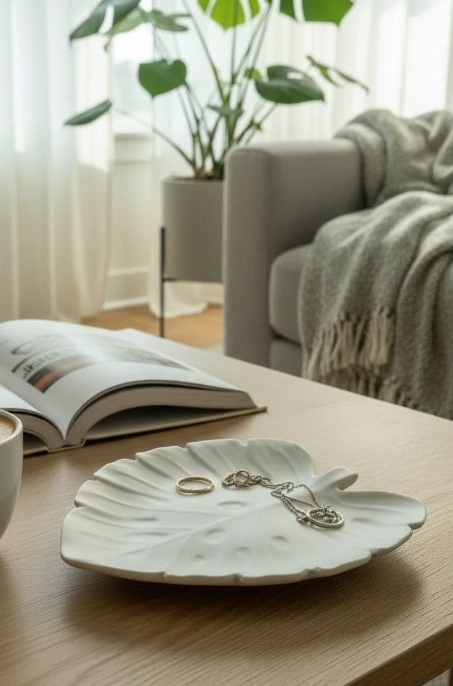 A bandeja em formato monstera acolhe e organiza, o copo corações acrescenta delicadeza ao quotidiano, e a vela em pérolas, ilumina o espaço com suavidade e presença.