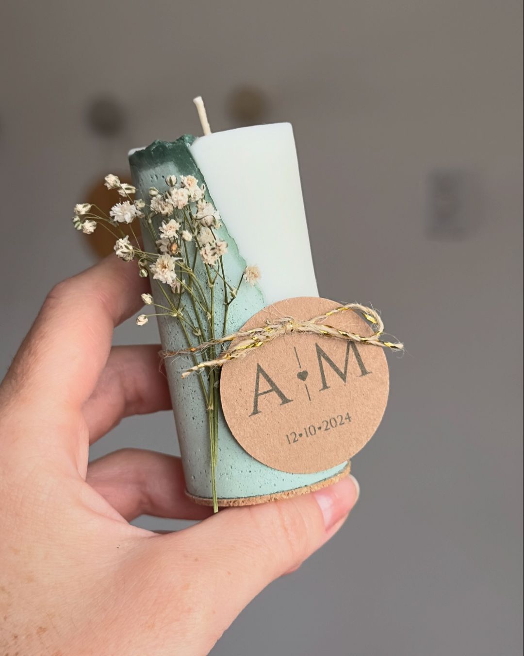 Vela com base de cimento. Etiqueta personalizada com flor seca. Cor do cimento personalizada.